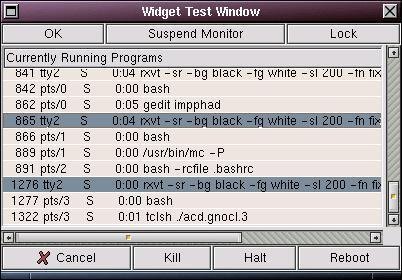 Look alike of Task Manager (like Windoze Me). Written in tcl/tk - displays the processes from which you can select one ( or many) and press the kill button. You can also Halt ,reboot lock and suspend monitor. Should be linked to alt+ctrl+del hotkeys.