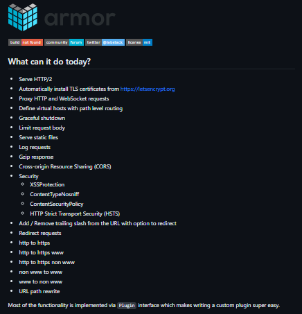 Uncomplicated, modern HTTP server. Serve HTTP/2. Automatically install TLS certificates from https://letsencrypt.org. Proxy HTTP and WebSocket requests. Define virtual hosts with path level routing. Graceful shutdown. Limit request body. Serve static files. Log requests. Gzip response. Cross-origin Resource Sharing (CORS). Security, XSSProtection. ContentTypeNosniff. ContentSecurityPolicy. HTTP Strict Transport Security (HSTS). Add/Remove trailing slash from the URL with the option to redirect.