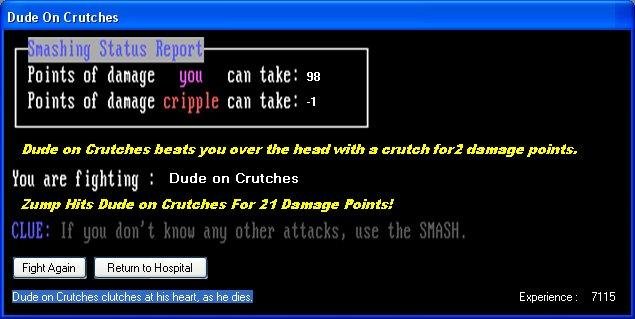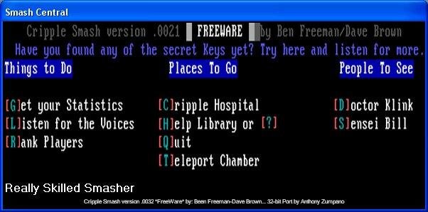 A Re-Write of the early 90's BBS door game "Cripple Smash" by Been Freeman. It will utilize his original artwork, text, and (to the best of my ability) recreate the feeling of the original game. If you'd like to contribute or complain, Contact Me.
