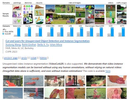 CutLER is an approach for unsupervised object detection and instance segmentation that trains detectors without human-annotated labels, and the repo also includes VideoCutLER for unsupervised video instance segmentation. The method follows a “Cut-and-LEaRn” recipe: bootstrap object proposals, refine them iteratively, and train detection/segmentation heads to discover objects across diverse datasets. The codebase provides training and inference scripts, model configs, and references to benchmarking results that report large gains over prior unsupervised baselines. It’s intended for researchers exploring self-supervised and unsupervised recognition, offering a practical path to scale beyond costly labeled corpora. The README links papers and gives a high-level overview of components and expected outputs, with pointers to demos and assets. The repository is actively starred and structured as a typical research release with license, contribution guidelines, and security policy.
