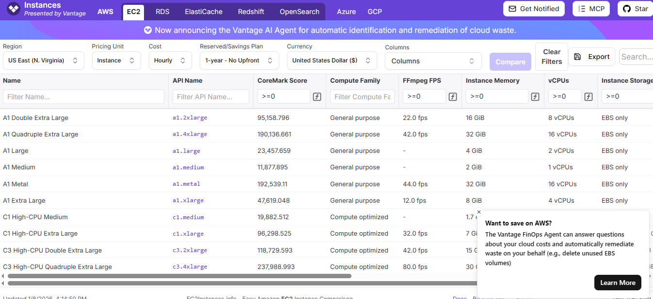 ec2instances is an open-source project that powers an intuitive, searchable comparison site for Amazon EC2 instance types, helping developers and cloud architects quickly evaluate compute options without the friction of navigating multiple AWS console screens. The site aggregates key metrics — including CPU, memory, storage, networking specs, and pricing — across many instance families, and lets users filter, sort, and visually compare configurations side by side. It was created to simplify decision-making for cloud provisioning, making it easier to choose the best instance type for performance and cost goals, and it’s maintained by the Vantage community to stay updated with current AWS offerings and user suggestions. Contributors use automated scrapers and workflows in the repository to fetch, update, and curate the underlying data that powers the comparison interface, and the site itself supports API access for programmatic integration into tools or dashboards.