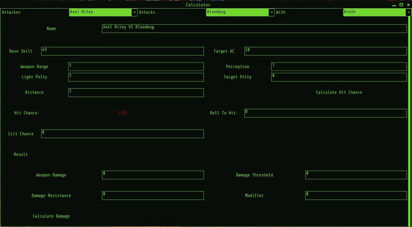 This is a simple Fallout PnP to Hit Calculator that will allow you to add Character, Weapons, Beasts, and Attack for ease in the calculation. Added in the file is a Guide that will inform you on how the application works