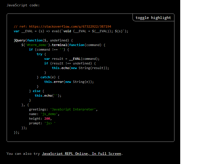 jQuery Terminal is a JavaScript library for creating command-line interpreters in your applications. You can use this JavaScript Terminal library to create interactive web-based terminal applications on your website. Where commands are defined by you. You can define them on the server or in the browser's JavaScript. It can automatically call JSON-RPC service when the user types a command. Alternatively, you can provide an object with methods; each method will be invoked on the user's command (the python command can create python interpreter). An object can have nested objects which will create a nested interpreter (you can create an interactive menu of adventure games with this). You can also use a function in which you can parse user commands by yourself (you have full control of what users type into the terminal). It's ideal if you want to provide additional functionality for power users.