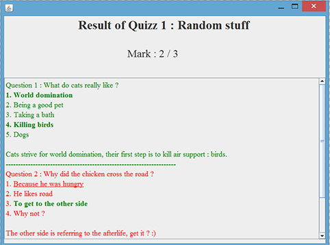 JQuizz is a toolkit to easily create swing based multiple choice questions (or Quizz). It tries his best to make your life easier by making you focus only on the actual content of your quizz, and not spending time on the machinery.