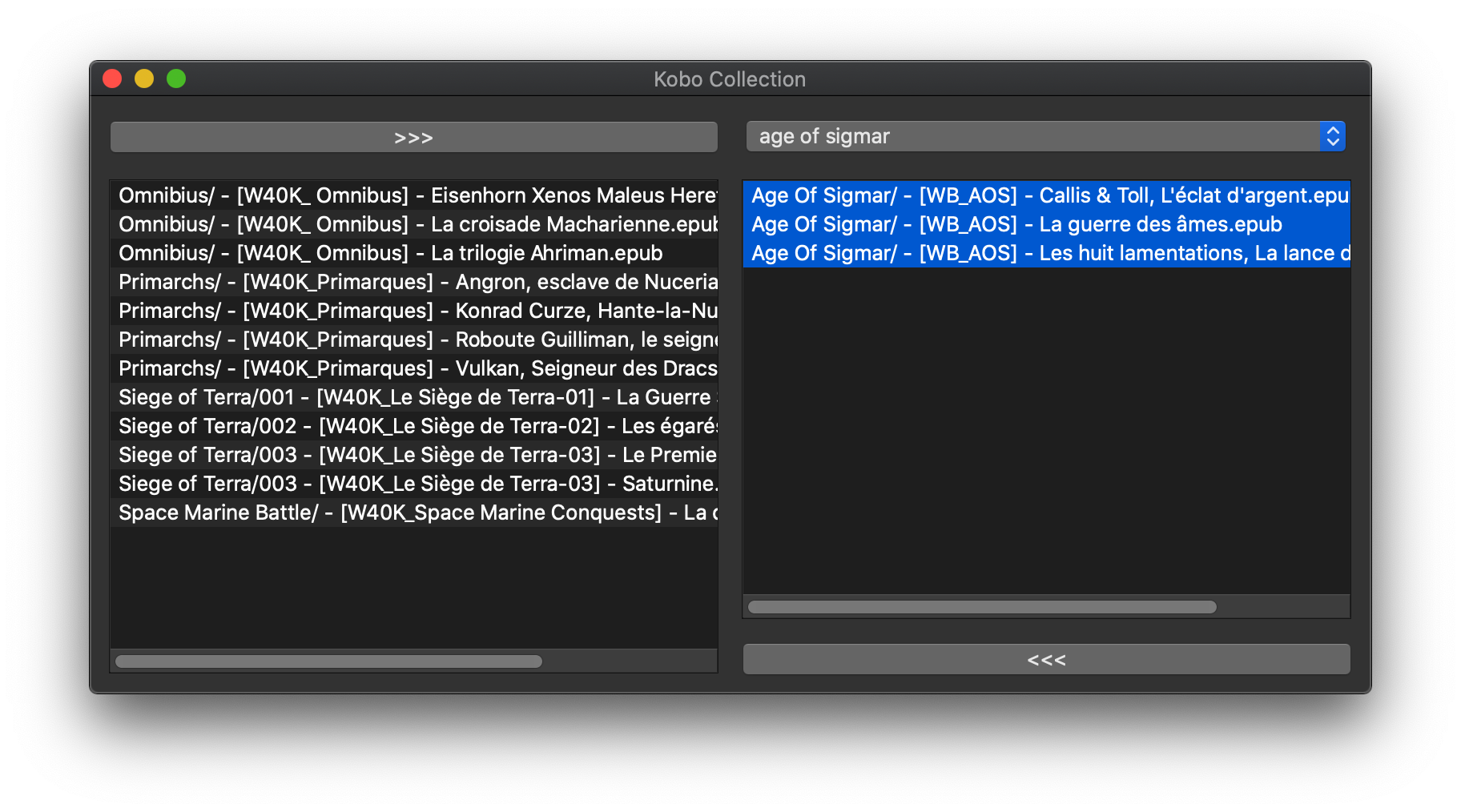 - On the app, select on the left the books you want to pass on the shelf list in the top right and click the button >>> to upload them on it