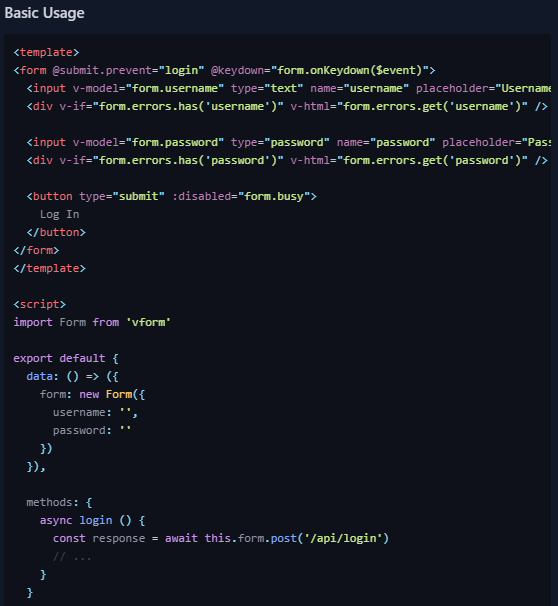 Handle Laravel-Vue forms and validation with ease. vform is a tiny library for Vue 2/3 to help with forms and validation when using Laravel as a back-end. It provides a form instance to wrap your data in a convenient way and send it to your Laravel application via an HTTP request using axios.