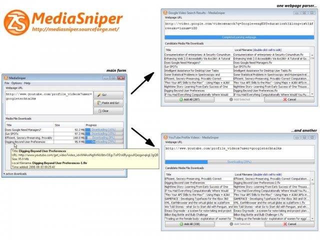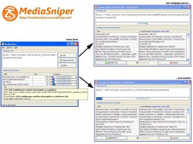 Simple downloader for media files from popular websites. Just provide the webpage URL and MediaSniper will identify the media files for downloading. Supports YouTube (including playlists, favorites, profile videos, and search results), and Google Video.