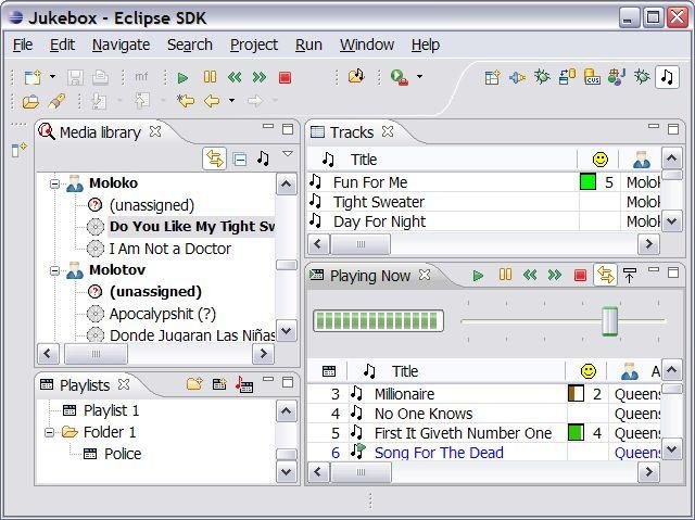 An eclipse (3.3) plug-in for playing and organizing music files (mp3, ogg, few others). Defines a "Jukebox" perspective. Supports playlists, rating, DnD. Requires Java 5. Update site: http://musicplugin.sourceforge.net/update