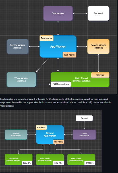neo.mjs is the next-generation UI framework for creating desktop & mobile Web Apps. It has a very strong focus on performance and creating scalable & modular architectures. A clean & consistent API, as well as the ability to run without any build processes, will increase the productivity of your team while creating better solutions at the same time. While current libraries/frameworks like Angular, React or Vue provide reasonable performance for small or mostly static Apps, they lack when it comes to big Apps or complex Components. The problem is, that most Apps today run within a single thread (CPU), while each computer or mobile device has several CPUs available. Some Apps move expensive tasks into separate threads, but this is by far not enough. Using neo.mjs, most parts of the framework as well as the Apps which you create with it, run inside a separate thread. This architecture leaves the main thread mostly idle, so it can fully concentrate on its purpose.