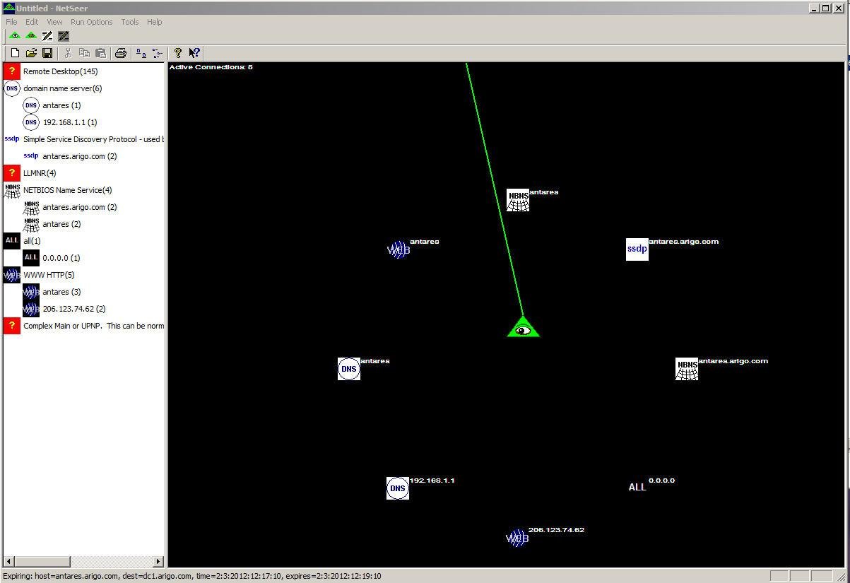 NetSeer is a Windows based (XP, 7, 2000 - 2008) network traffic visualization tool. NetSeer listens for traffic, renders connections in treeview and in a graphic radar screen in the right pane.