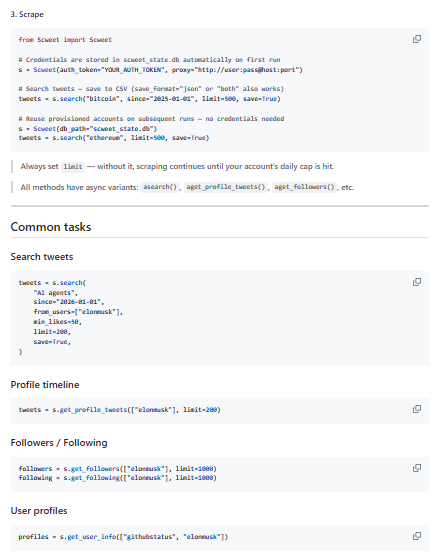Scweet is a Python-based Twitter/X scraping library and CLI designed to collect tweets, profile timelines, followers, following lists, and user profile data without requiring the official Twitter/X API or a developer account. Instead of depending on deprecated unauthenticated scraping methods, it works by using X’s web GraphQL API together with authenticated browser cookies, which gives it a more current and practical approach for data extraction. The project supports a broad set of collection patterns, including searches by keyword, hashtag, user, date range, engagement thresholds, language, and location, making it useful for research, monitoring, and data gathering workflows. It is built for both local use and higher-volume runs, with support for proxies, dedicated accounts, and multi-account cookie handling to improve reliability at scale. Scweet also includes asynchronous method variants, a command-line interface, automatic credential persistence in a local database, etc.