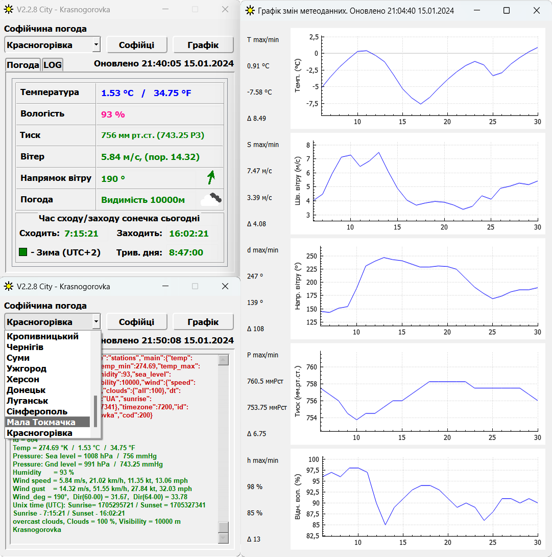 - Displays the time of sunrise/sunset, length of daylight for the selected city (regional centers of Ukraine).