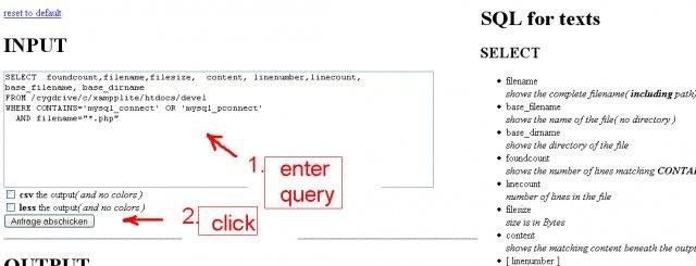 texQL, "sQL for Text" grants you sql-like access to all ascii-files on the filesystem. eg: SELECT foundcount,filename,filesize,content,linenumber,linecount FROM ./ WHERE CONTAINS='mysql_connect' OR 'mysql_pconnect' AND filename="*.php"