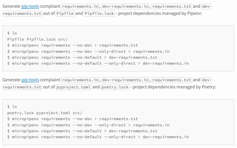 A lightweight wrapper for pip to support requirements.txt, Pipenv and Poetry lock files or converting them to pip-tools compatible output. Designed for containerized Python applications but not limited to them. if requirements.txt state all the packages in a pinned version with hashes (e.g. pip-tools), micropipenv installs packages with a possible fallback if the installation order is relevant. micropipenv does not substitute Poetry it rather complements it for containerized deployments where the size of the container image and software shipped with it matters. I would like to have a tool that "rules them all" - one lightweight tool to support all Python dependency lock file managers (pip-tools, Poetry, Pipenv) and lets users decide what they want to use when deploying Python applications in containerized environments (e.g. Kubernetes, OpenShift, ...).
