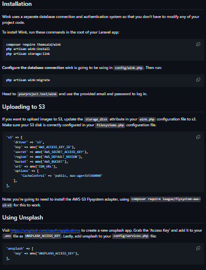Wink adds a nice UI where you can manage a publication of any size with posts, pages, tags, and authors. You can add photos, code blocks, featured images, social media & SEO attributes, embedded HTML (YouTube Videos, Embedded Podcasts Episodes, Tweets, ...), and markdown. If you want to upload images to S3, update the storage_disk attribute in your wink.php configuration file to s3. Make sure your S3 disk is correctly configured in your filesystems.php configuration file.