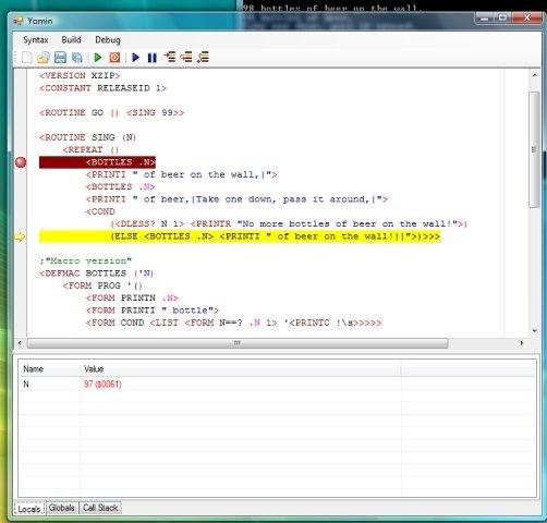 - Set breakpoints, step through code, display variables and call stack
