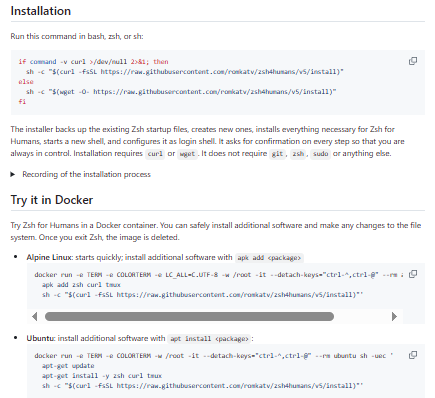 Zsh for Humans is a turnkey Zsh configuration that aims to give users a powerful, feature-rich shell “that just works” out of the box. Instead of requiring you to pick and wire together many plugins and themes yourself, it bundles a curated set of Zsh plugins and settings into a coherent, production-ready configuration. The project handles prompt customization, completions, key bindings, history management, and Git integration for you, all tuned for responsiveness and low latency. It is designed to feel like a finished product rather than a DIY starter kit, so new users can get a high-quality shell experience with a single install command. At the same time, it provides escape hatches and configuration points so advanced users can layer their own aliases, functions, and styles on top of the base setup. The maintainer notes that the project now has limited support and few new features planned, but the existing feature set is already extensive and stable for everyday use.