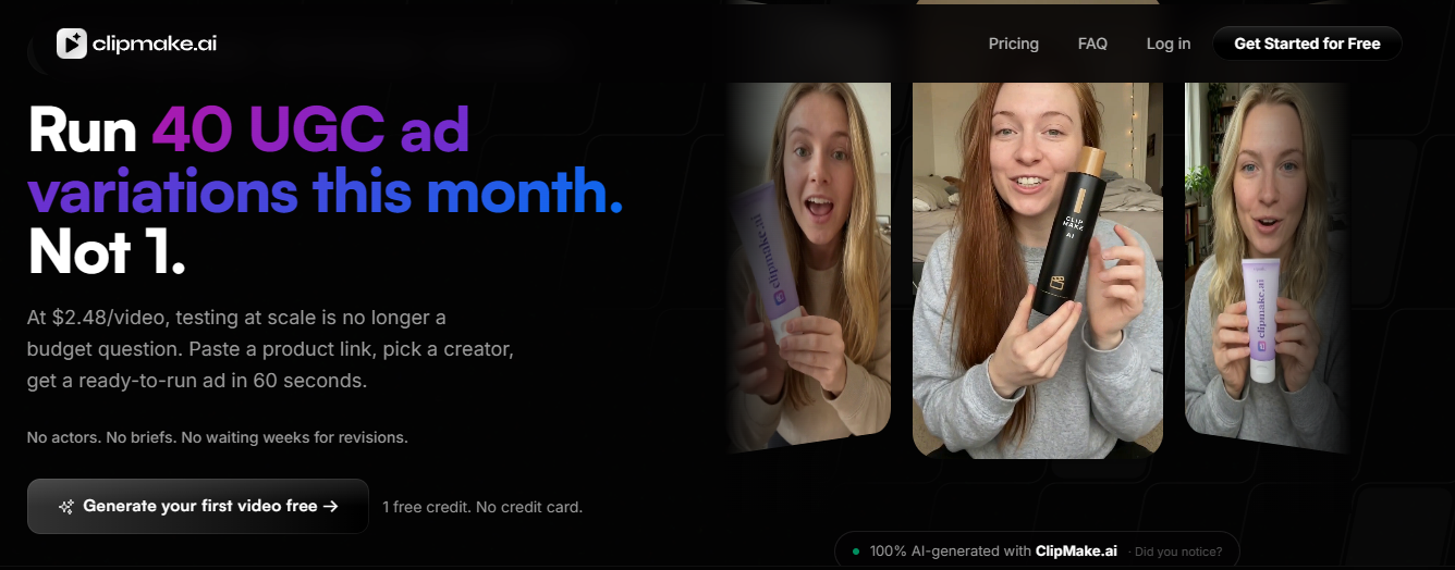 ClipMake.ai is an AI-powered platform designed to generate user-generated content-style video ads quickly and at scale without requiring real creators, filming, or editing. It enables users to turn a product idea, image, or URL into a complete video ad in minutes by automating the entire workflow, from script creation to final rendering. It includes pre-installed AI creators (avatars) that simulate real people, allowing users to select a persona, voice, and style that matches their target audience. It also provides built-in script generation based on proven advertising frameworks, producing structured content with hooks, problem-solution narratives, proof points, and calls to action. Users can upload a product image or paste a product URL, after which the system automatically extracts key details and generates multiple ad variations for testing. The videos are rendered with natural voiceovers, lip sync, and product visuals, making them suitable for platforms.