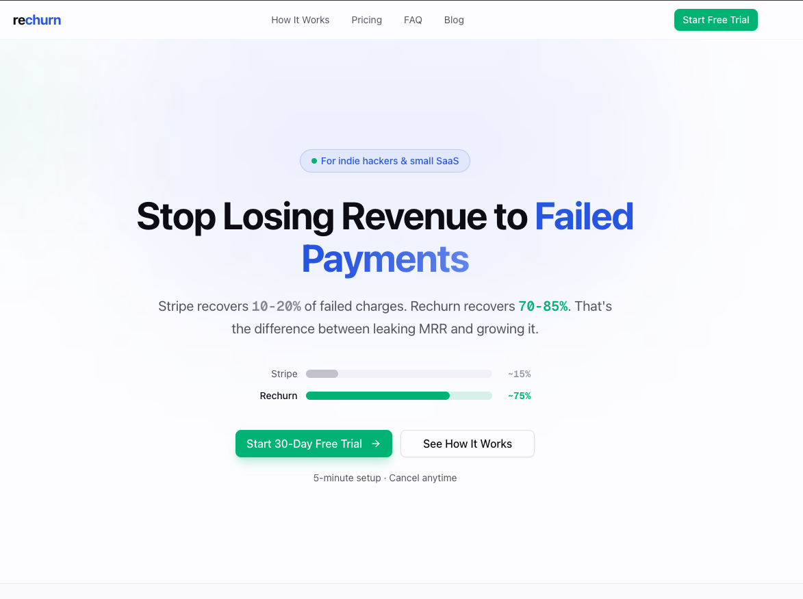 Rechurn recovers 70-85% of failed charges that Stripe's built-in retry logic misses, helping SaaS businesses eliminate involuntary churn and protect their MRR.