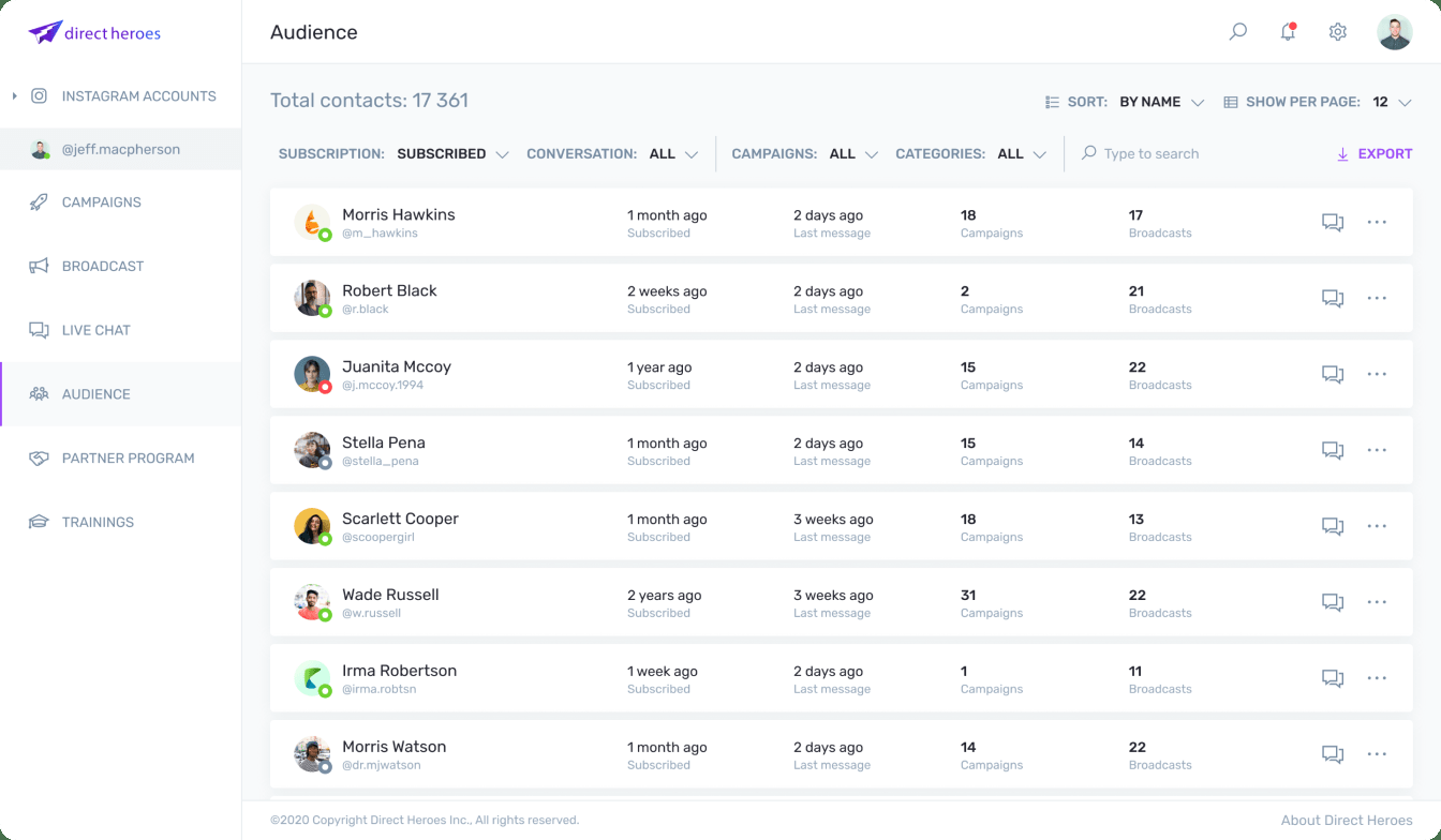 Direct Heroes helps you turn your followers into customers using modern marketing strategies right from your DMs. Connect, communicate, and convert to cultivate a better Instagram business. Direct Heroes provides you an innovative way to build a stronger community. Helping monetize your customers through the DMs. Direct Heroes gives you the ability to set up direct messaging campaigns in minutes. No coding required. Build additional assets to your business with your first Instagram contact list. The money is in the list. Personal connections to build closer relationships between your customers & team. Metrics that scale businesses better. Schedule and set tailored remarketing direct messaging campaigns. Safety is our number one priority. With our end to end encrypted technology we do not save or store your Instagram credentials.