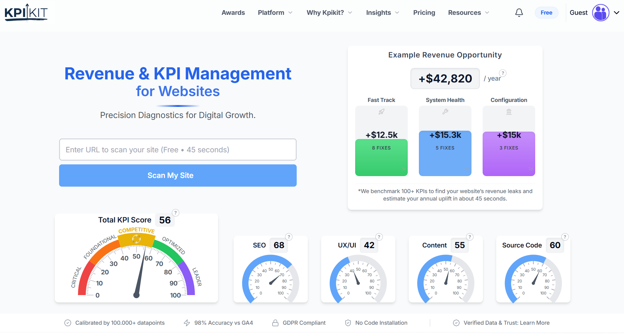 KPIKIT translates complex technical and marketing data into actual monetary impact. When you scan the site, we strip out technical noise and show you exactly where your site is leaking revenue, how much you're losing, and exactly how to prioritize the KPI fixes using the ICE framework. ICE is fine tuned and fully adjusted for your market's seasonality, geography and industry niche. No code, no scripts, and no sensitive data required. Just paste your URL and get a complete, real-time revenue assessment in 45 seconds.